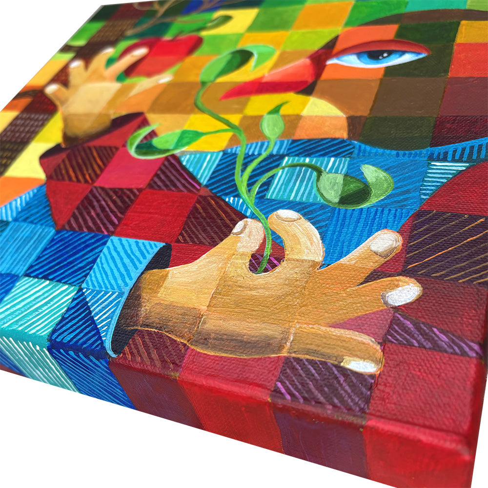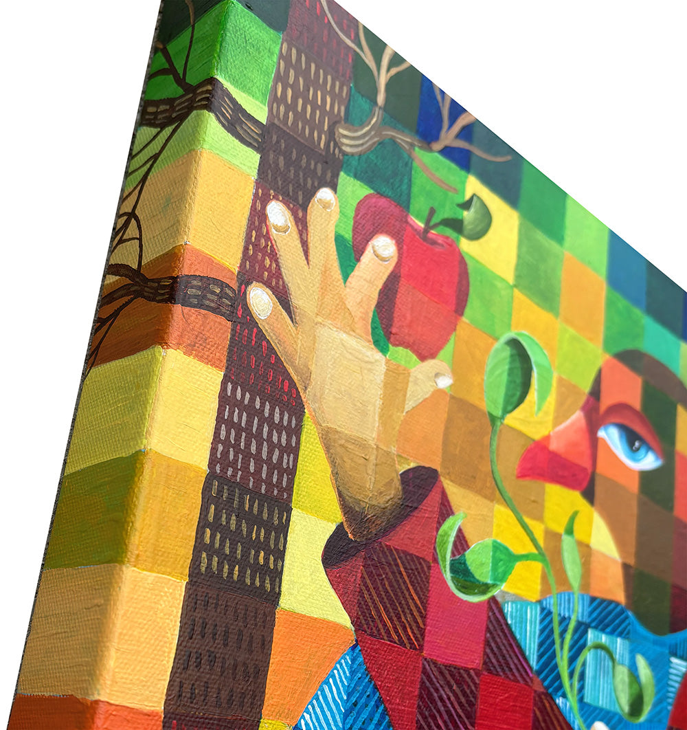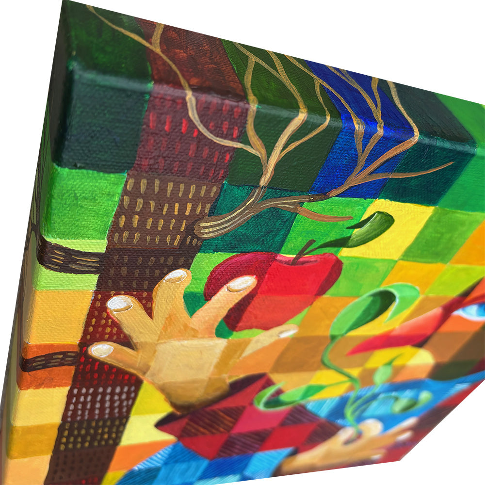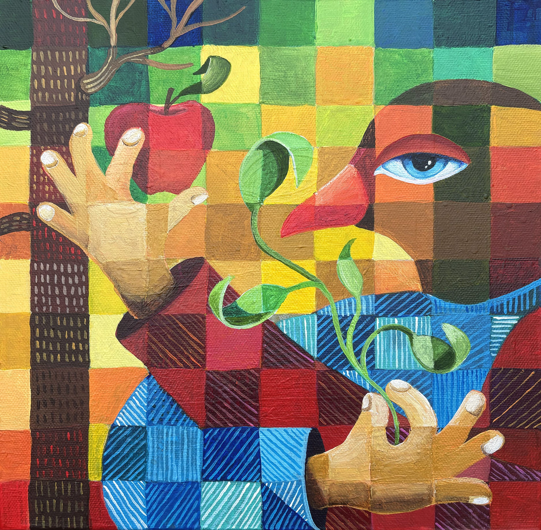A colorful painting of a bird person holding a stem of leaves and catching a falling apple. This is a 10 x 10", gallery wrap canvas, the painting extends to all sides.
