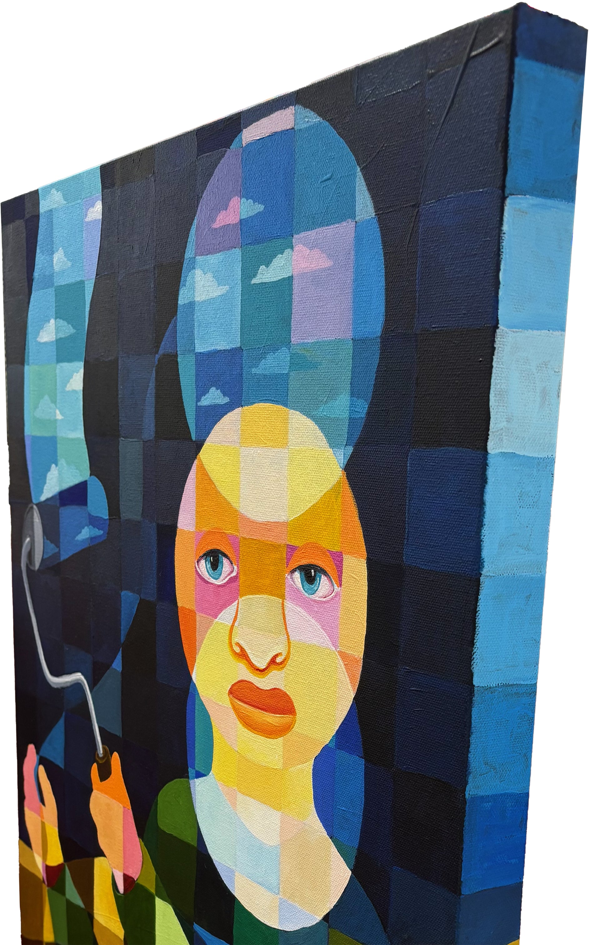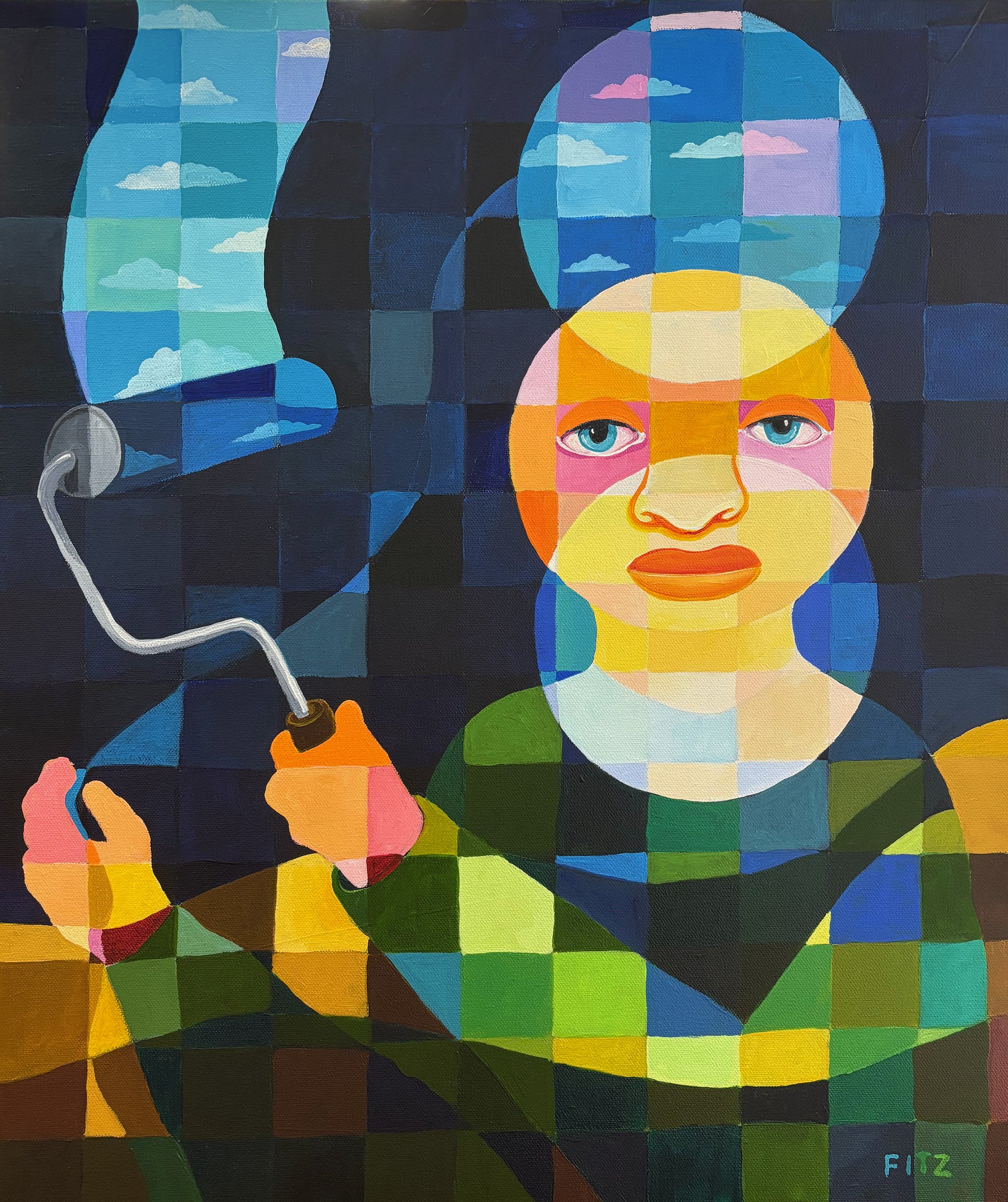 Contemporary painting of a person holding a balloon and using a painting roller to reveal a blue sky with white clouds behind dark blue squares. 20 x 25 inches.